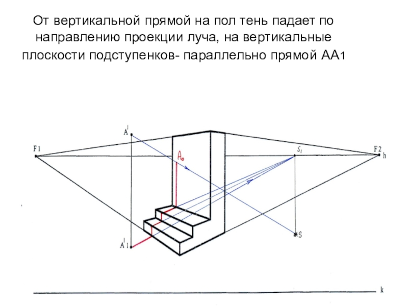 Слайд 575. От вертикальной прямой А-А1 тень падает по проекции луча