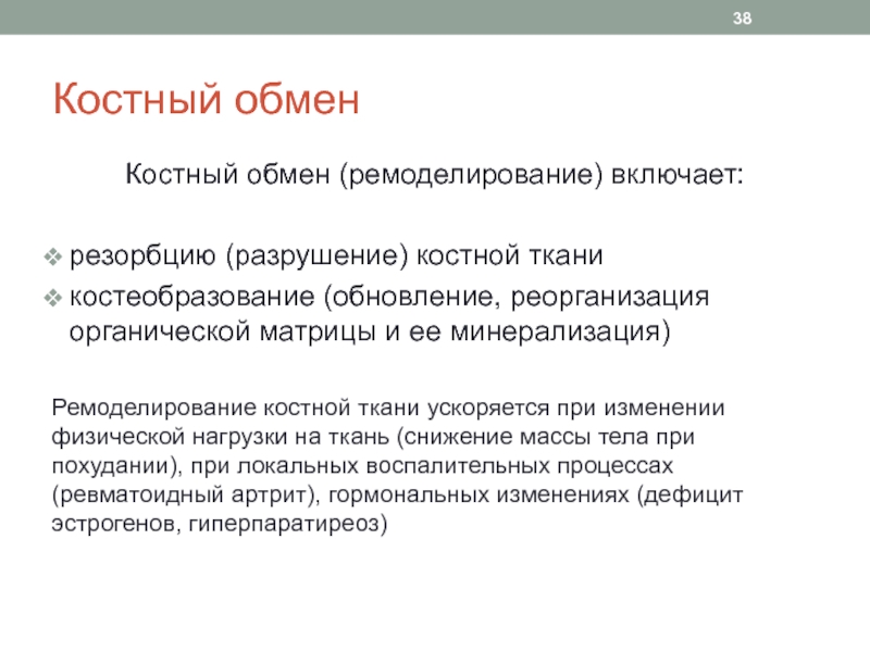 Гормоны щитовидной железы. При гипертиреозе увеличивается скорость обмена кости, повышается экскреция кальция с мочой, костеобразование начинает отставать от резорбции. При гипотиреозе замедляется образование и минерализация кости