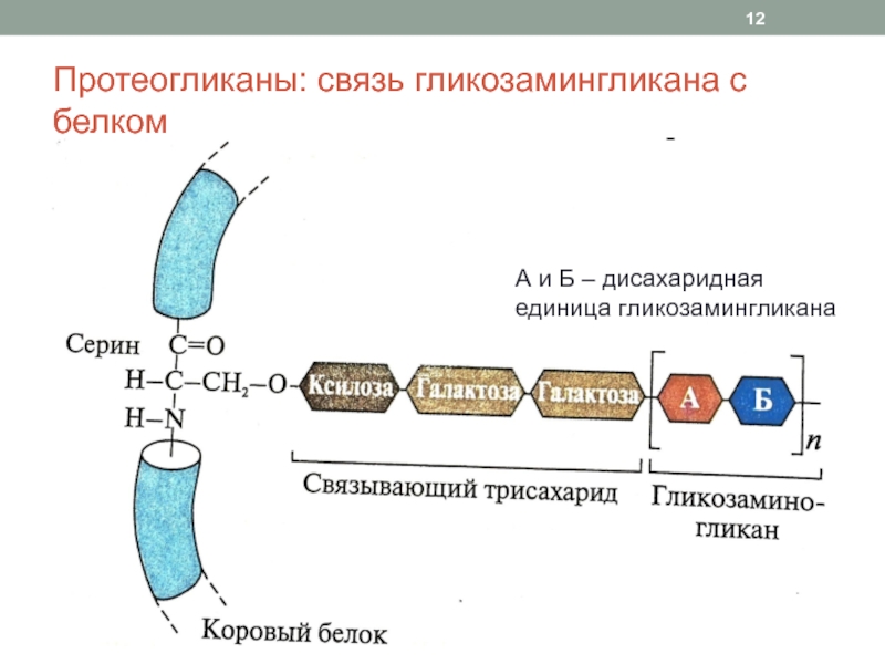 Слайд 12Протеогликаны: связь гликозамингликана с белком