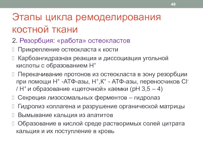 Перекачивание протонов из остеокласта в зону резорбции при помощи Н+ -АТФ-азы, Н+,К+ - АТФ-азы, переносчиков Сl- / Н+ и образование «щеточной» каемки (рН 3,5 – 4)