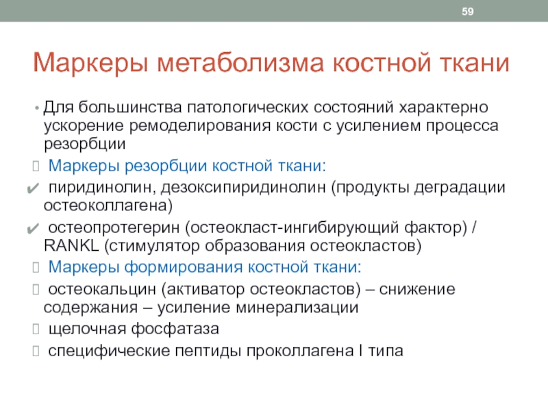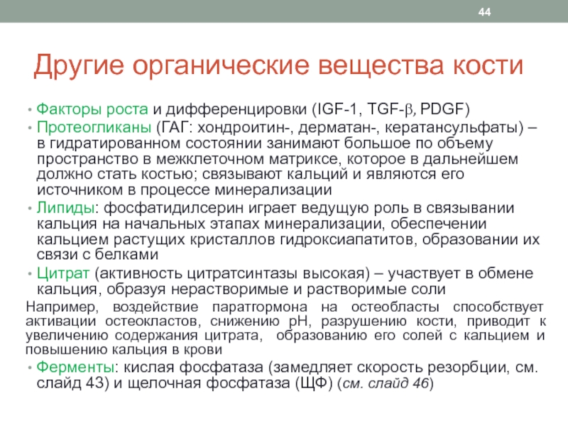 Ферменты: кислая фосфатаза (замедляет скорость резорбции, см. слайд 43) и щелочная фосфатаза (ЩФ) (см. слайд 46)