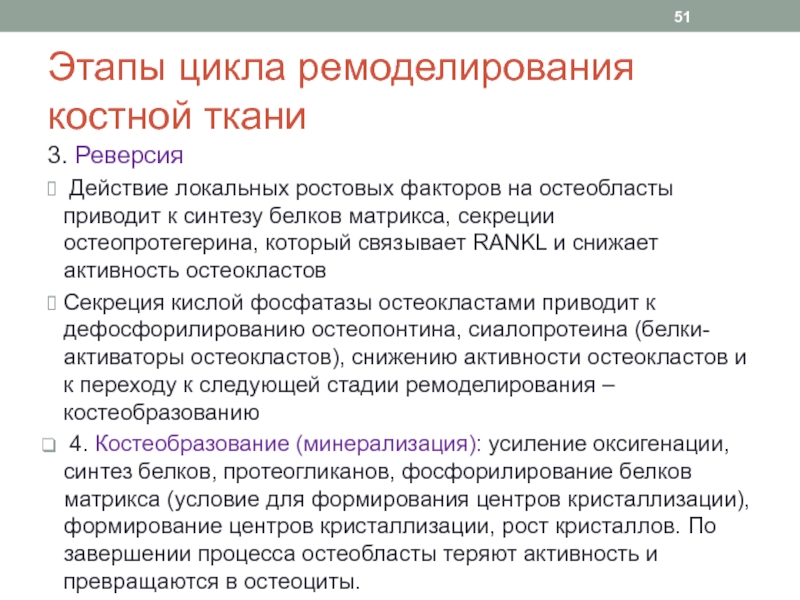 Секреция кислой фосфатазы остеокластами приводит к дефосфорилированию остеопонтина, сиалопротеина (белки-активаторы остеокластов), снижению активности остеокластов и к переходу к следующей стадии ремоделирования – костеобразованию