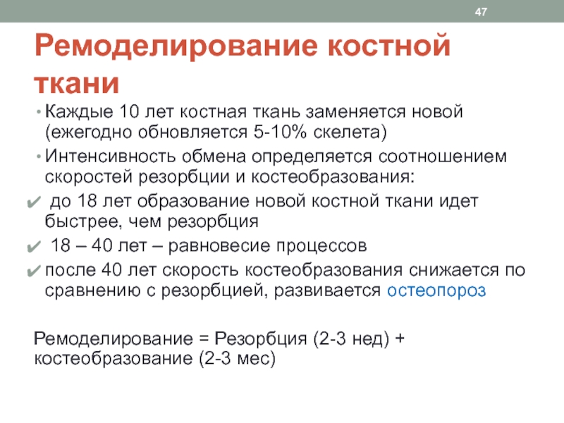 после 40 лет скорость костеобразования снижается по сравнению с резорбцией, развивается остеопороз