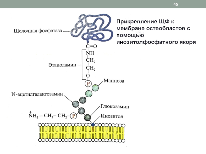 Слайд 45Прикрепление ЩФ к мембране остеобластов с помощью инозитолфосфатного якоря
