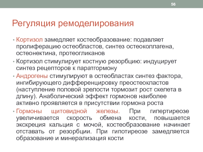 Кортизол замедляет костеобразование: подавляет пролиферацию остеобластов, синтез остеоколлагена, остеонектина,