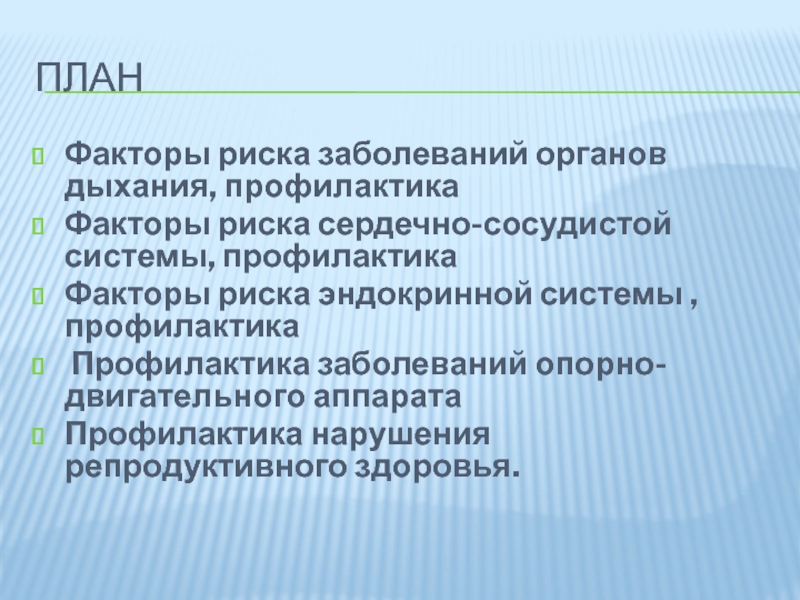Факторы риска и профилактику заболеваний органов дыхания, сердечно-сосудистой системы, эндокринной, нервной системы