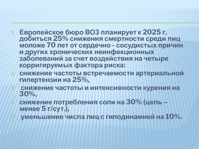 причин и других хронических неинфекционных заболеваний за счет воздействия на четыре корригируемых фактора риска: