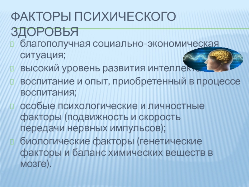 Слайд 51ФАКТОРЫ ПСИХИЧЕСКОГО ЗДОРОВЬЯ