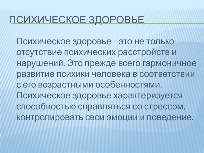 соответствии с его возрастными особенностями. Психическое здоровье характеризуется способностью справляться со стрессом, контролировать свои эмоции и поведение.