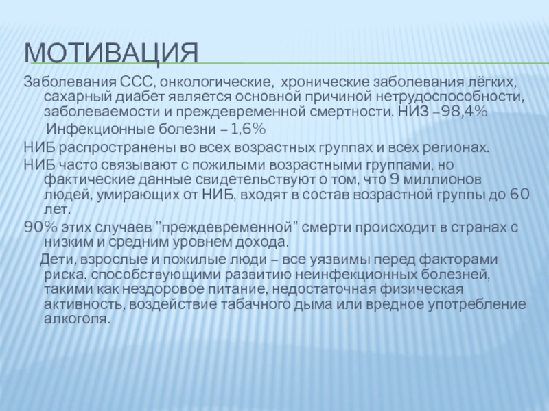 причиной нетрудоспособности, заболеваемости и преждевременной смертности. НИЗ –98,4%