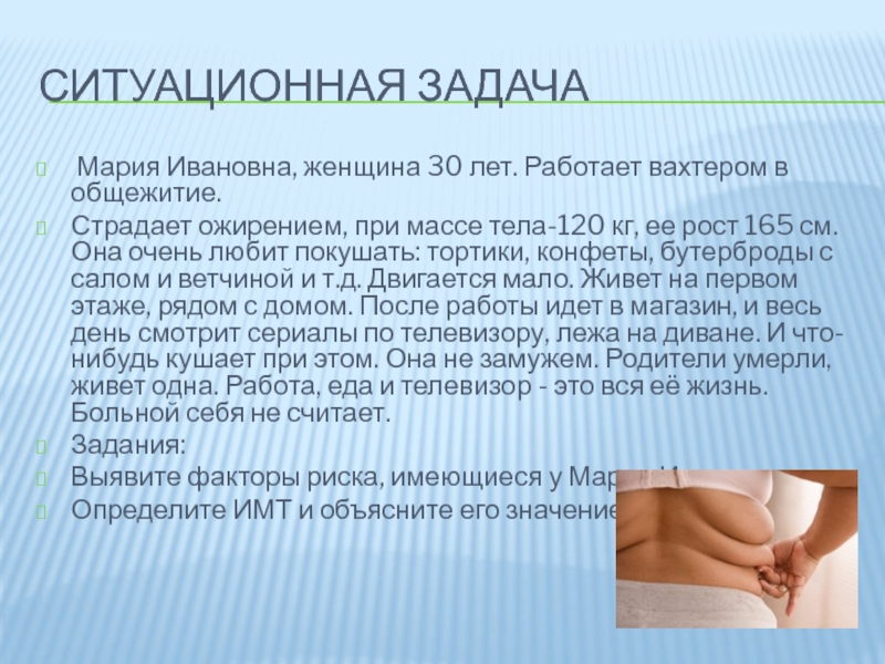 очень любит покушать: тортики, конфеты, бутерброды с салом и ветчиной и т.д. Двигается мало. Живет на первом этаже, рядом с домом. После работы идет в магазин, и весь день смотрит сериалы по телевизору, лежа на диване. И что-нибудь кушает при этом. Она не замужем. Родители умерли, живет одна. Работа, еда и телевизор - это вся её жизнь. Больной себя не считает.