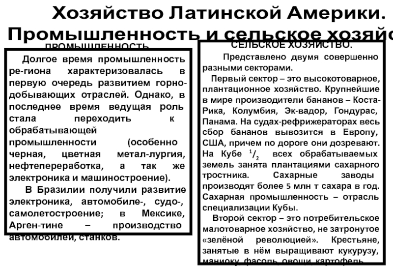 Первый сектор – это высокотоварное, плантационное хозяйство. Крупнейшие в мире производители бананов – Коста-Рика, Колумбия, Эк-вадор, Гондурас, Панама. На судах-рефрижераторах весь сбор бананов вывозится в Европу, США, причем по дороге они дозревают. На Кубе 1/2 всех обрабатываемых земель занята плантациями сахарного тростника. Сахарные заводы производят более 5 млн т сахара в год. Сахарная промышленность – отрасль специализации Кубы.