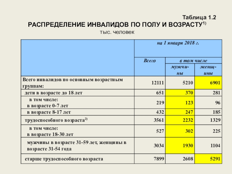 Таблица 1.2РАСПРЕДЕЛЕНИЕ ИНВАЛИДОВ ПО ПОЛУ И ВОЗРАСТУ1)тыс. человек