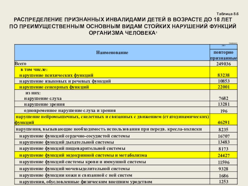 Таблица 8.6РАСПРЕДЕЛЕНИЕ ПРИЗНАННЫХ ИНВАЛИДАМИ ДЕТЕЙ В ВОЗРАСТЕ ДО 18 ЛЕТ  ПО ПРЕИМУЩЕСТВЕННЫМ ОСНОВНЫМ ВИДАМ СТОЙКИХ НАРУШЕНИЙ