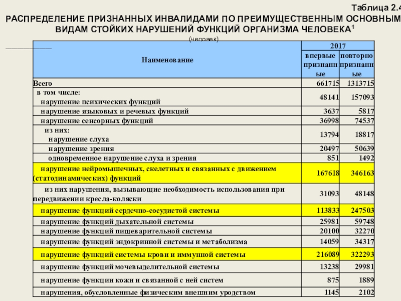 Таблица 2.4РАСПРЕДЕЛЕНИЕ ПРИЗНАННЫХ ИНВАЛИДАМИ ПО ПРЕИМУЩЕСТВЕННЫМ ОСНОВНЫМ  ВИДАМ СТОЙКИХ НАРУШЕНИЙ ФУНКЦИЙ ОРГАНИЗМА ЧЕЛОВЕКА1(человек) _______________