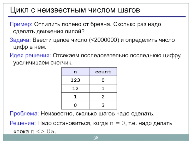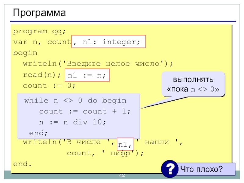 Решение: Надо остановиться, когда n = 0, т.е. надо делать «пока n <> 0».