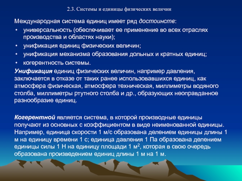 Когерентной является система, в которой производные единицы получают из основных с коэффициентом в виде неименованной единицы. Например, единица скорости 1 м/с образована делением единицы длины 1 м на единицу времени 1 с; единица давления 1 Па образована делением единицы силы 1 Н на единицу площади 1 м2, которая в свою очередь образована произведением единиц длины 1 м на 1 м.