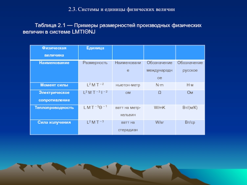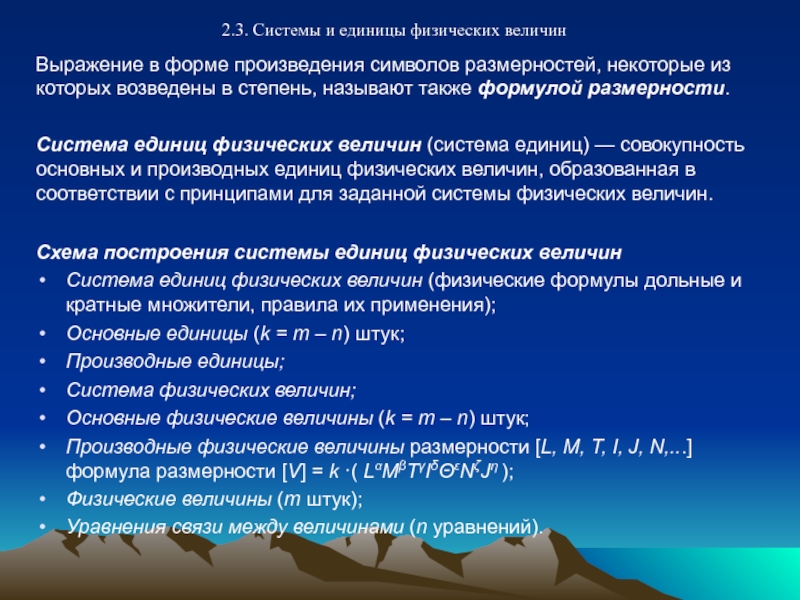 Производные физические величины размерности [L, M, T, I, J, N,...] формула размерности [V] = k ·( LαMβTγIδΘεNζJη );