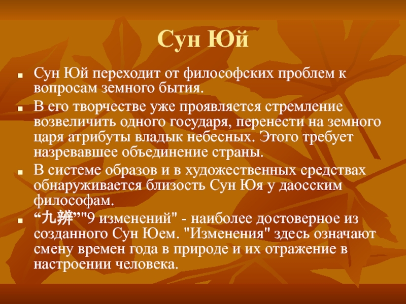 “九辨”"9 изменений" - наиболее достоверное из созданного Сун Юем. "Изменения" здесь означают смену времен года в природе и их отражение в настроении человека.