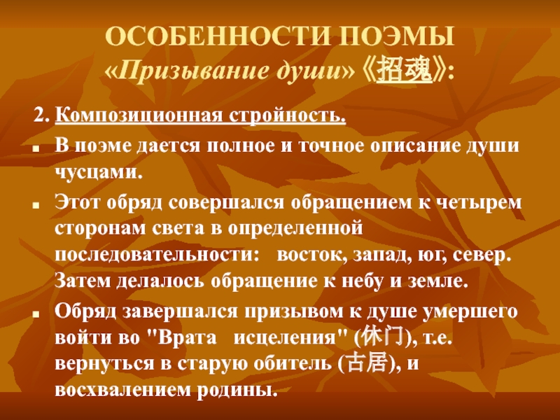 Обряд завершался призывом к душе умершего войти во "Врата исцеления" (休门), т.е. вернуться в старую обитель (古居), и восхвалением родины.