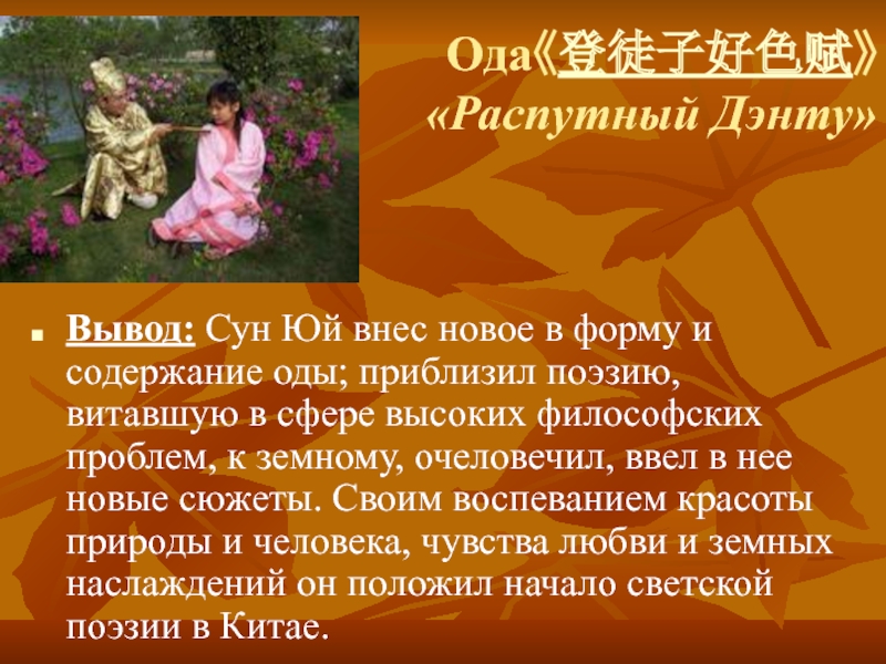 к земному, очеловечил, ввел в нее новые сюжеты. Своим воспеванием красоты природы и человека, чувства любви и земных наслаждений он положил начало светской поэзии в Китае.