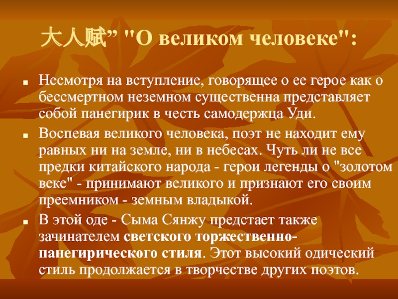 В этой оде - Сыма Сянжу предстает также зачинателем светского торжественно-панегирического стиля. Этот высокий одический стиль продолжается в творчестве других поэтов.