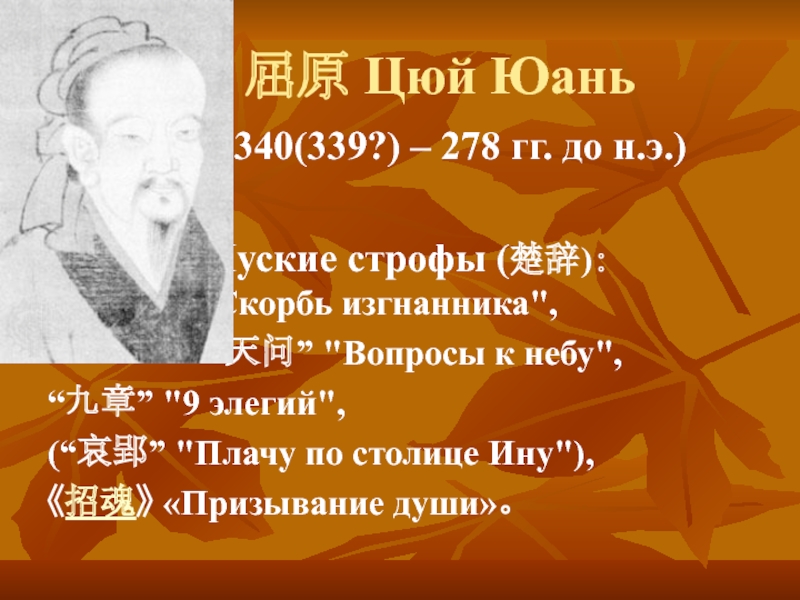 Слайд 9屈原 Цюй Юань“离骚” поэма "Скорбь изгнанника" ("Скорбь отлученного")