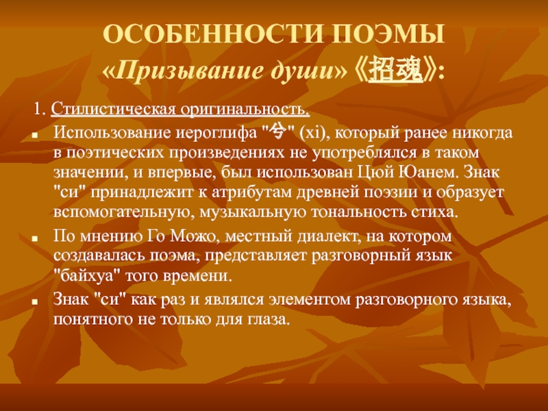 По мнению Го Можо, местный диалект, на котором создавалась поэма, представляет разговорный язык "байхуа" того времени.