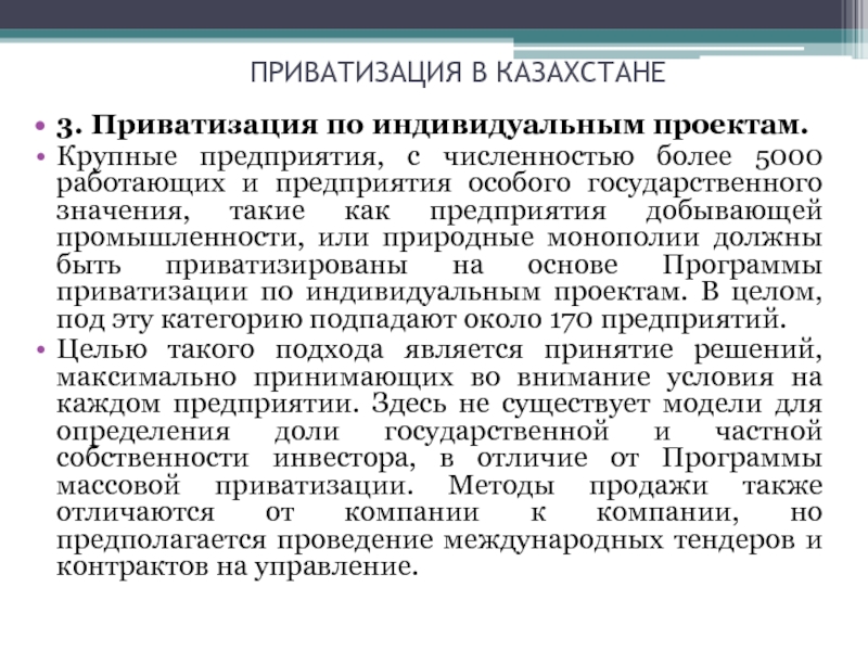 предприятия добывающей промышленности, или природные монополии должны быть приватизированы на основе Программы приватизации по индивидуальным проектам. В целом, под эту категорию подпадают около 170 предприятий.