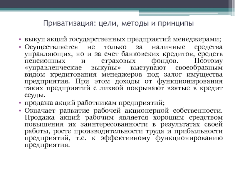 Осуществляется не только за наличные средства управляющих, но и за счет банковских кредитов, средств пенсионных и страховых фондов. Поэтому «управленческие выкупы» выступают своеобразным видом кредитования менеджеров под залог имущества предприятия. При этом доходы от функционирования таких предприятий с лихвой покрывают взятые в кредит ссуды.