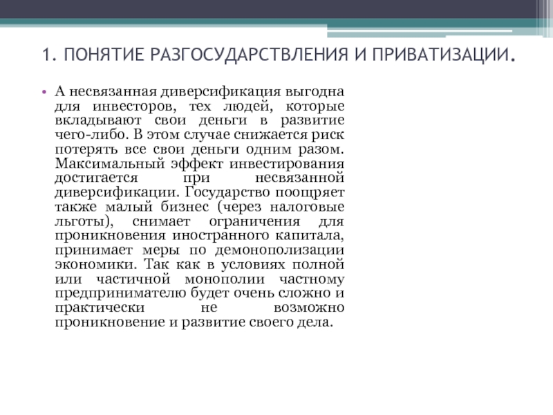этом случае снижается риск потерять все свои деньги одним разом. Максимальный эффект инвестирования достигается при несвязанной диверсификации. Государство поощряет также малый бизнес (через налоговые льготы), снимает ограничения для проникновения иностранного капитала, принимает меры по демонополизации экономики. Так как в условиях полной или частичной монополии частному предпринимателю будет очень сложно и практически не возможно проникновение и развитие своего дела.