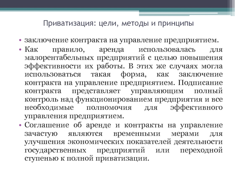 Как правило, аренда использовалась для малорентабельных предприятий с целью повышения эффективности их работы. В этих же случаях могла использоваться такая форма, как заключение контракта на управление предприятием. Подписание контракта представляет управляющим полный контроль над функционированием предприятия и все необходимые полномочия для эффективного управления предприятием.