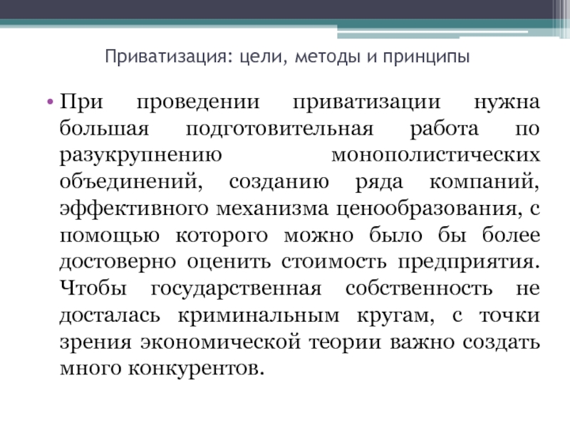 При проведении приватизации нужна большая подготовительная работа по разукрупнению монополистических объединений, созданию ряда компаний, эффективного механизма ценообразования, с помощью которого можно было бы более достоверно оценить стоимость предприятия. Чтобы государственная собственность не досталась криминальным кругам, с точки зрения экономической теории важно создать много конкурентов. [1]