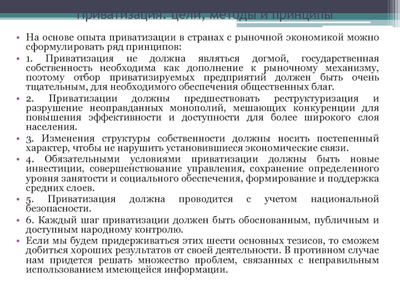 На основе опыта приватизации в странах с рыночной экономикой можно сформулировать ряд принципов: