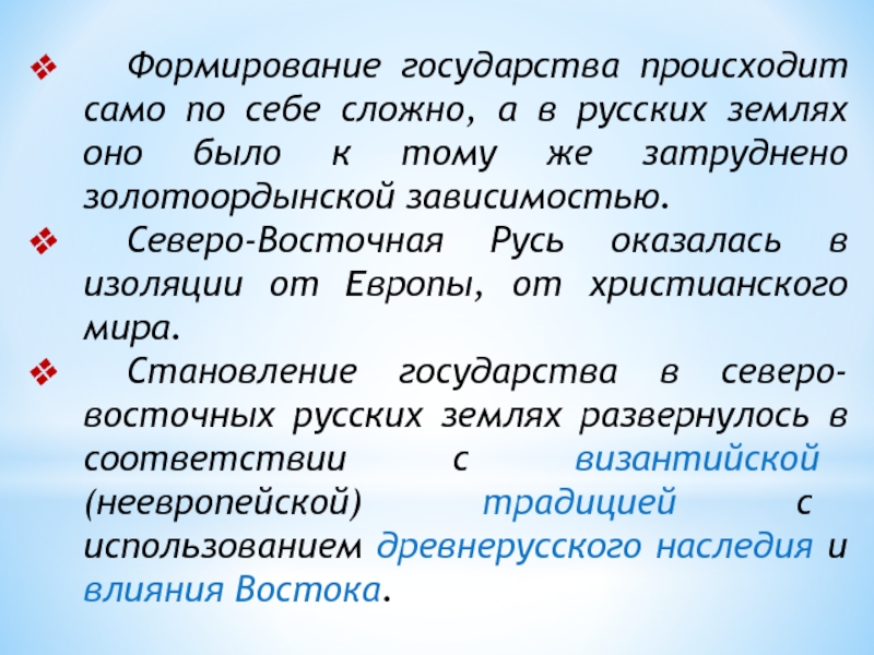 Становление государства в северо-восточных русских землях развернулось в соответствии с византийской (неевропейской) традицией с использованием древнерусского наследия и влияния Востока.
