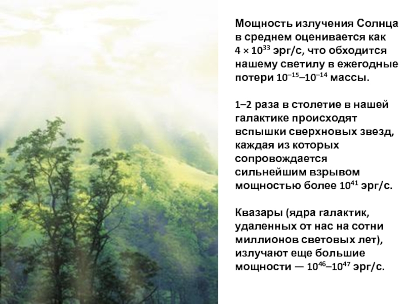 в нашей галактике происходят вспышки сверхновых звезд, каждая из которых сопровождается сильнейшим взрывом мощностью более 1041 эрг/с. Квазары (ядра галактик, удаленных от нас на сотни миллионов световых лет), излучают еще большие мощности — 1046–1047 эрг/с.