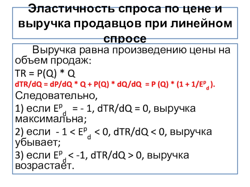 Слайд 13Эластичность спроса по цене и выручка продавцов при линейном спросе
