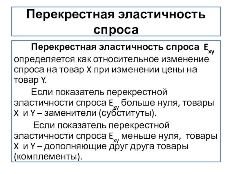 Если показатель перекрестной эластичности спроса Exy меньше нуля, товары X и Y – дополняющие друг друга товары (комплементы).