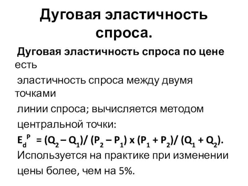 спроса - это отношение процентного изменения величины спроса к процентному изменению цены (может быть использован при изменении цены не более, чем на 5%):