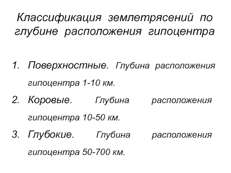 Классификация землетрясений по глубине расположения гипоцентраПоверхностные. Глубина расположения гипоцентра 1-10 км.Коровые. Глубина расположения гипоцентра 10-50 км.Глубокие. Глубина