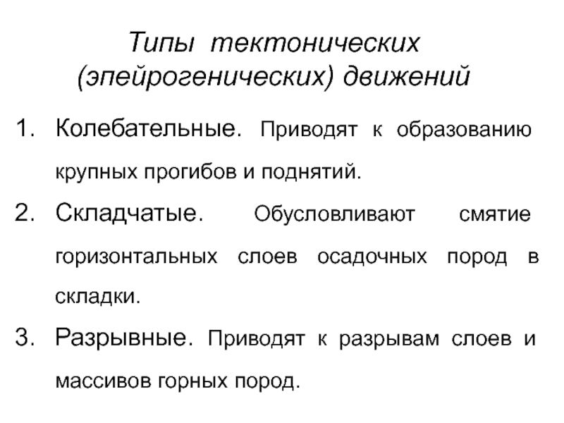 Типы тектонических (эпейрогенических) движенийКолебательные. Приводят к образованию крупных прогибов и поднятий. Складчатые. Обусловливают смятие горизонтальных слоев осадочных