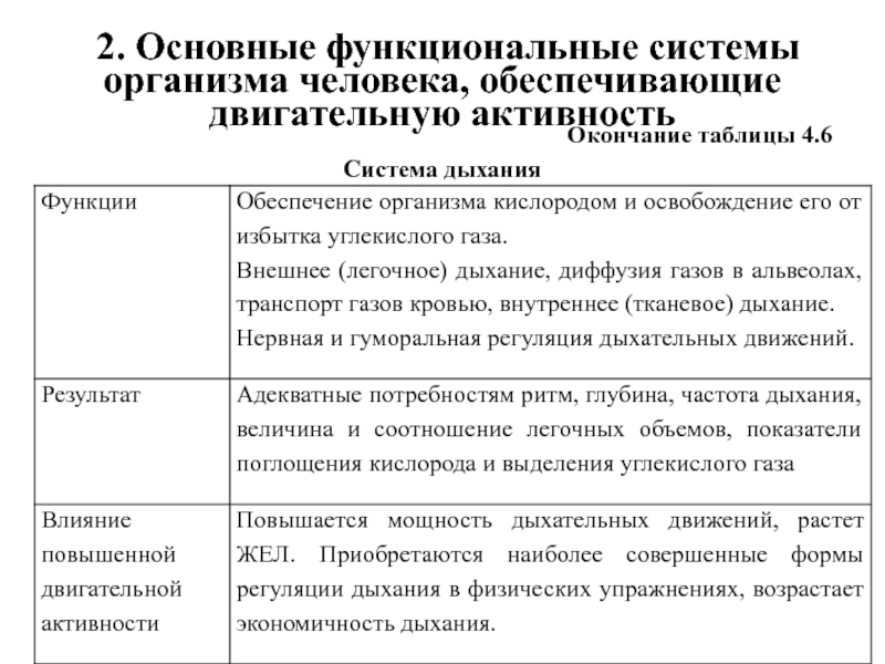 2. Основные функциональные системы организма человека, обеспечивающие двигательную активностьОкончание таблицы 4.6Система дыхания