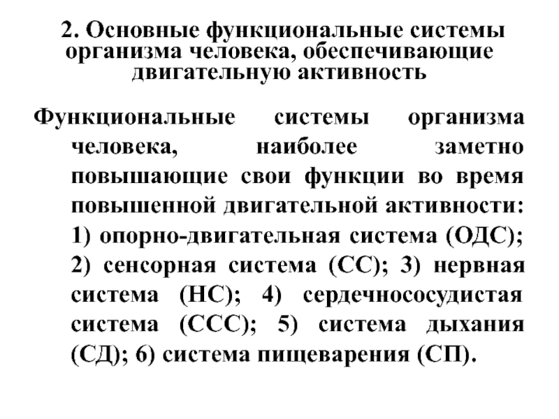 2. Основные функциональные системы организма человека, обеспечивающие двигательную активностьФункциональные системы организма человека, наиболее заметно повышающие свои функции