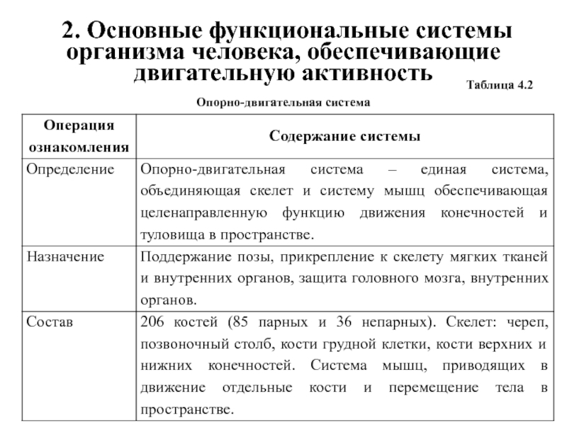 2. Основные функциональные системы организма человека, обеспечивающие двигательную активностьТаблица 4.2Опорно-двигательная система