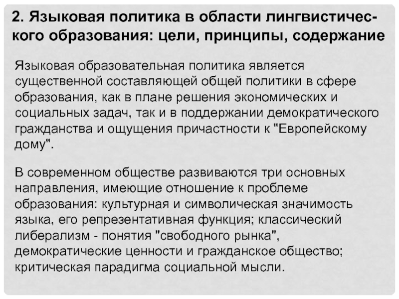 В современном обществе развиваются три основных направления, имеющие отношение к проблеме образования: культурная и символическая значимость языка, его репрезентативная функция; классический либерализм - понятия "свободного рынка", демократические ценности и гражданское общество; критическая парадигма социальной мысли.