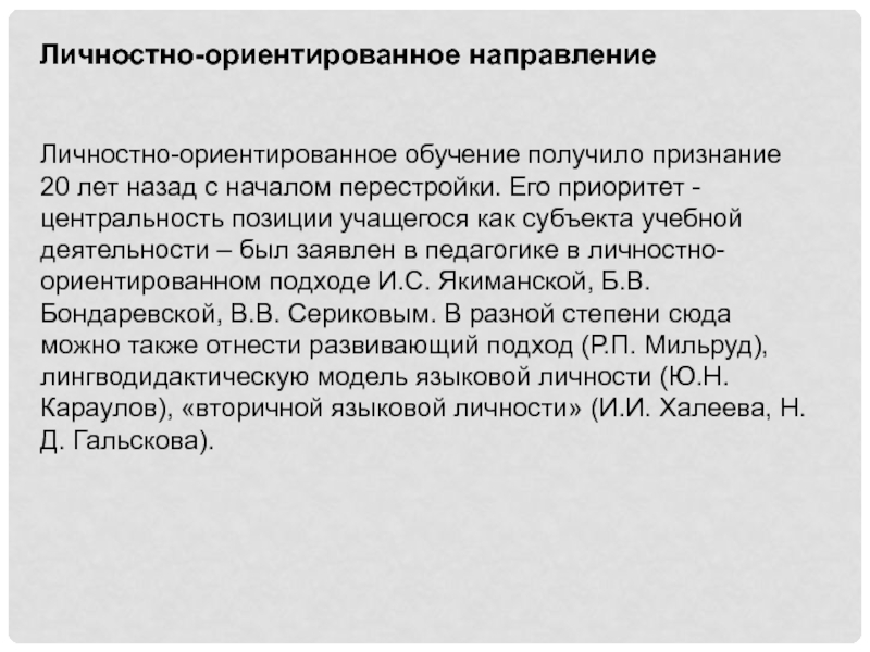 деятельности – был заявлен в педагогике в личностно-ориентированном подходе И.С. Якиманской, Б.В. Бондаревской, В.В. Сериковым. В разной степени сюда можно также отнести развивающий подход (Р.П. Мильруд), лингводидактическую модель языковой личности (Ю.Н. Караулов), «вторичной языковой личности» (И.И. Халеева, Н.Д. Гальскова).