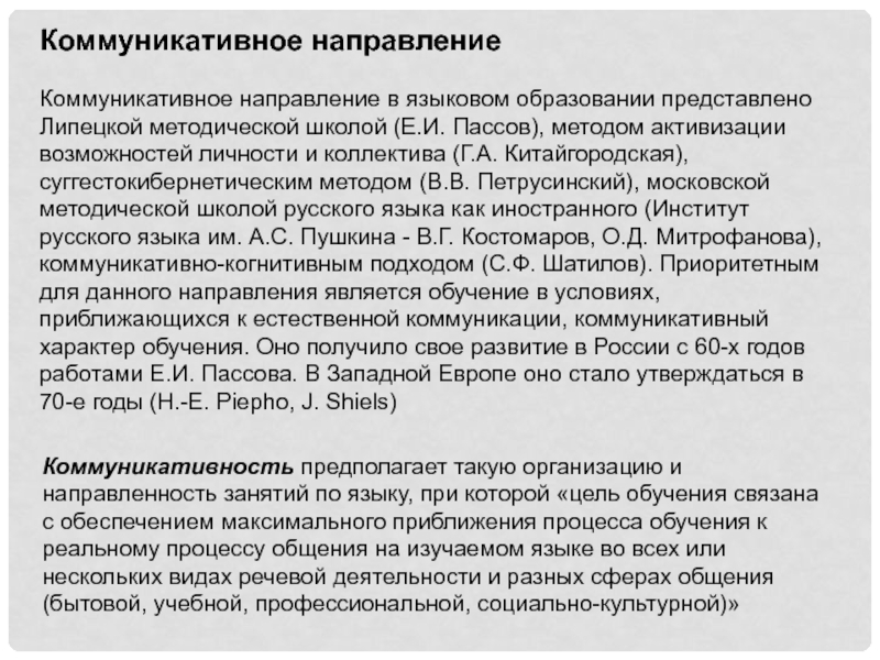 суггестокибернетическим методом (В.В. Петрусинский), московской методической школой русского языка как иностранного (Институт русского языка им. А.С. Пушкина - В.Г. Костомаров, О.Д. Митрофанова), коммуникативно-когнитивным подходом (С.Ф. Шатилов). Приоритетным для данного направления является обучение в условиях, приближающихся к естественной коммуникации, коммуникативный характер обучения. Оно получило свое развитие в России с 60-х годов работами Е.И. Пассова. В Западной Европе оно стало утверждаться в 70-е годы (H.-E. Piepho, J. Shiels)