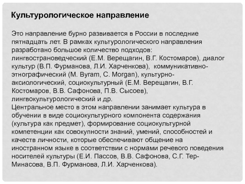 (Е.М. Верещагин, В.Г. Костомаров), диалог культур (В.П. Фурманова, Л.И. Харченкова), коммуникативно-этнографический (M. Byram, C. Morgan), культурно-аксиологический, социокультурный (Е.М. Верещагин, В.Г. Костомаров, В.В. Сафонова, П.В. Сысоев), лингвокультурологический и др.