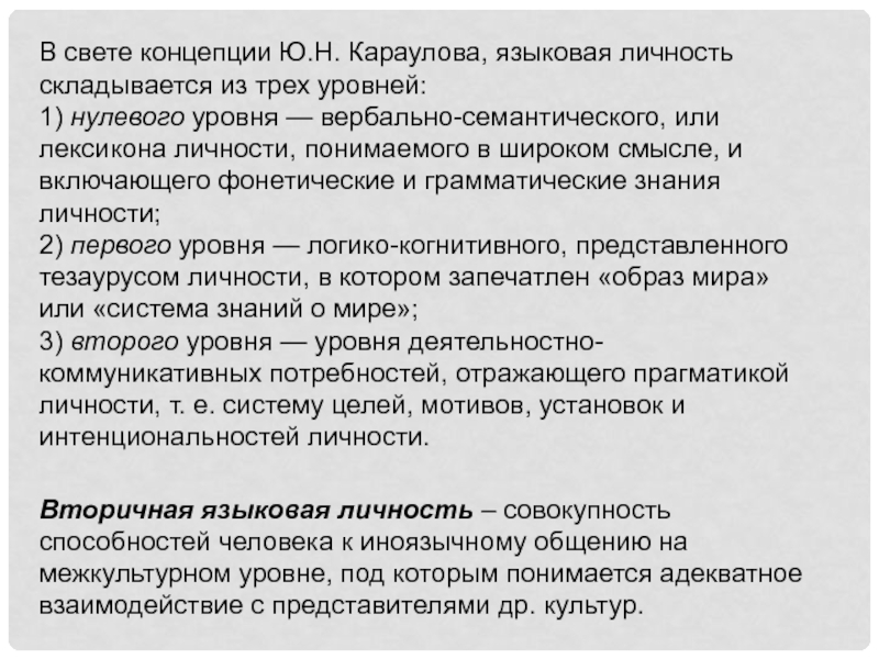 1) нулевого уровня — вербально-семантического, или лексикона личности, понимаемого в широком смысле, и включающего фонетические и грамматические знания личности;