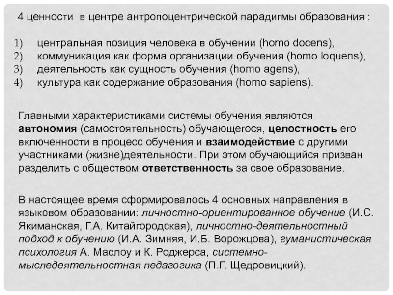 В настоящее время сформировалось 4 основных направления в языковом образовании: личностно-ориентированное обучение (И.С. Якиманская, Г.А. Китайгородская), личностно-деятельностный подход к обучению (И.А. Зимняя, И.Б. Ворожцова), гуманистическая психология А. Маслоу и К. Роджерса, системно-мыследеятельностная педагогика (П.Г. Щедровицкий).